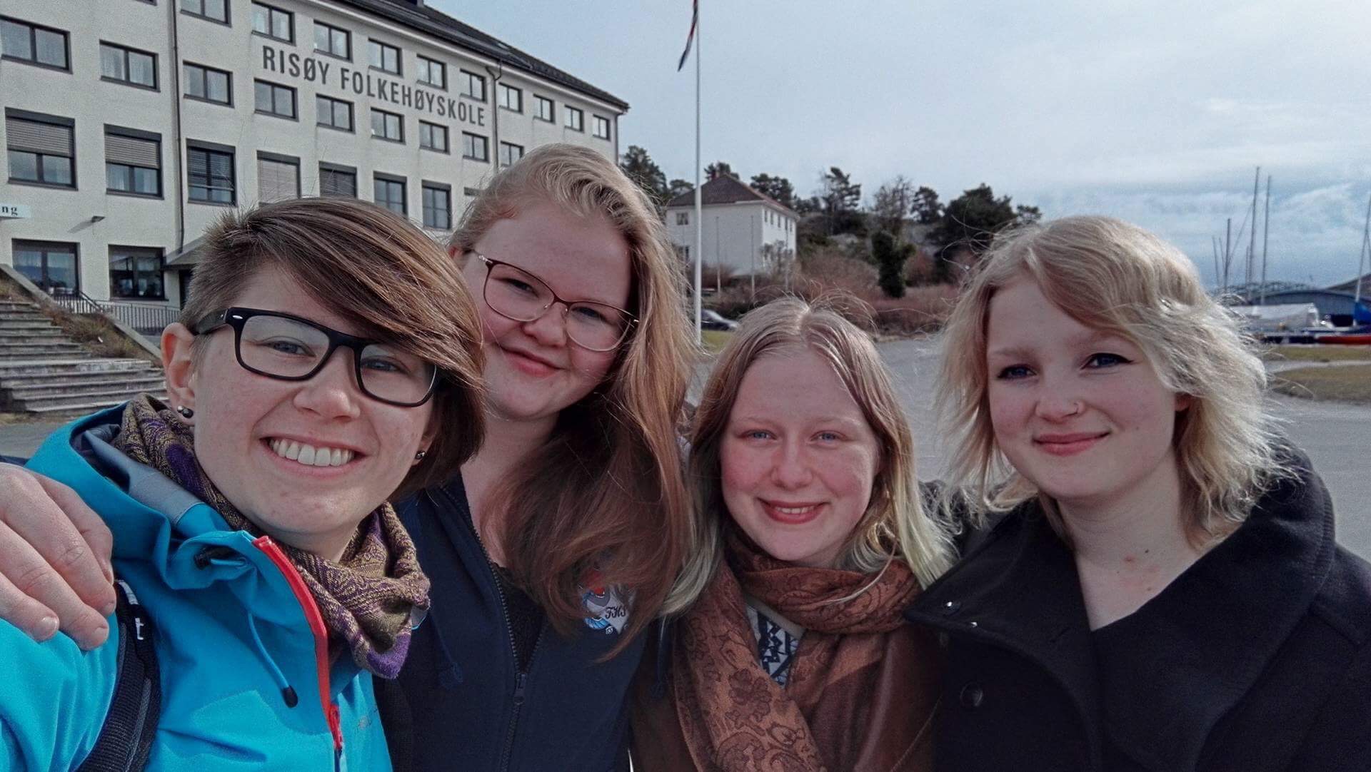 Kristine til høyre med sine tre bestevenninner fra året på Risøy. – På folkehøgskolen trengte jeg aldri å sitte alene. Foto: Privat