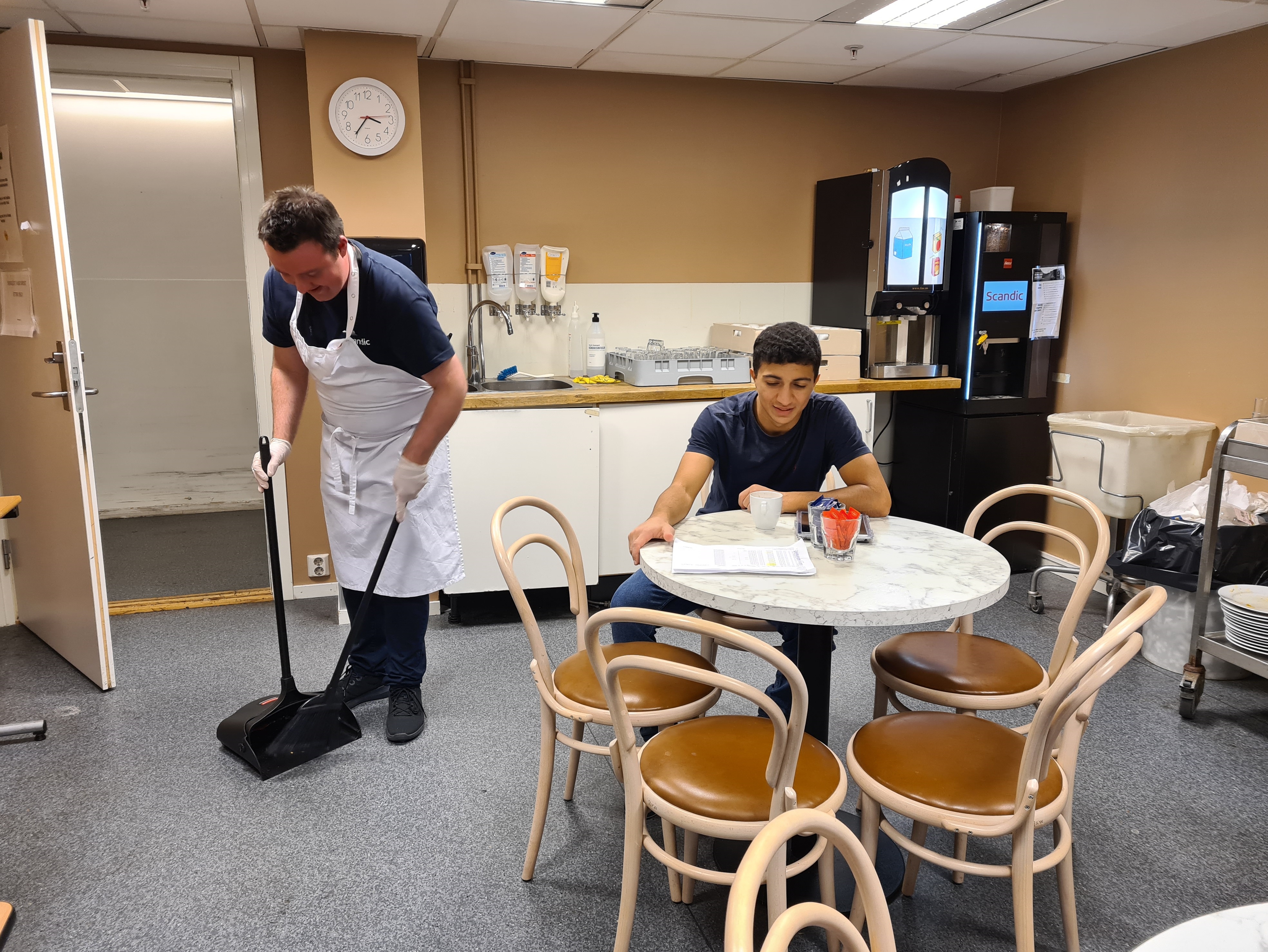 Hotellet er kjent for sin gode frokost, en gode som også de ansatte får nyte godt av. Robert starter dagen med å rydde kantina etter de som har vært der på kvelden. Han finner nytt service på kjøkkenet, og når frokostserveringen er over henter han rester av varmmat til kantina. Gjennom hele dagen skal det være både mat og drikke tilgjengelig for ansatte. Robert sørger for at det alltid er orden, at kaffemaskina virker og at det er nok brød. Er det hektisk på andre avdelinger trår han til og hjelper stuepikene med å ta av sengetøy, eller støvsuger restauranten mellom frokost- og lunsjservering.