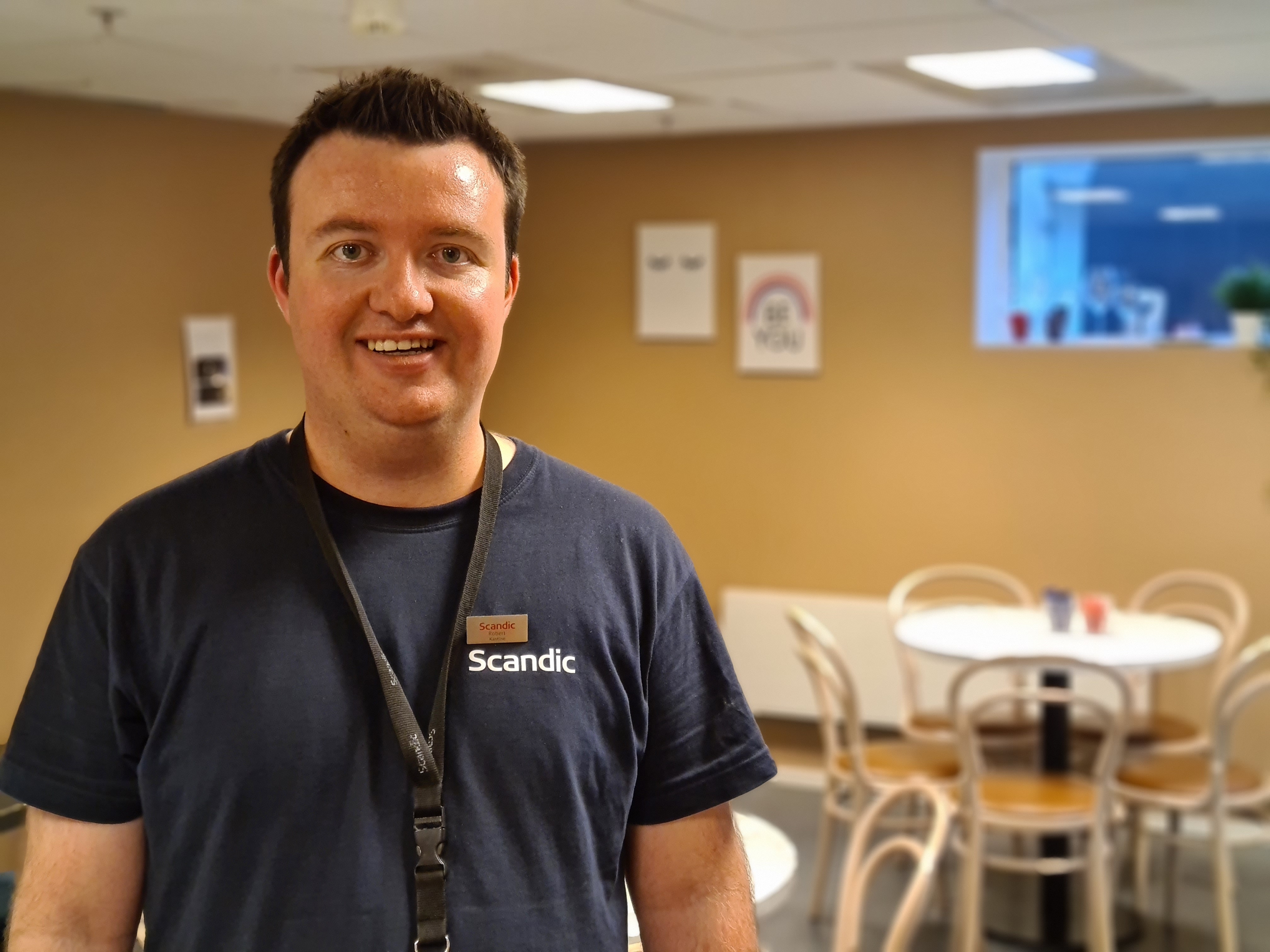 Han er i full gang med å vaske bord, rydde oppvask og fylle på i kjøleskapet etter dagens lunsj. I personalkantina på Scandic Nidelven er det han som har ansvaret. Alle som kommer innom får et smil og en kommentar. Robert kjenner så godt som alle som jobber på hotellet.