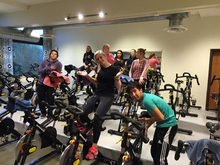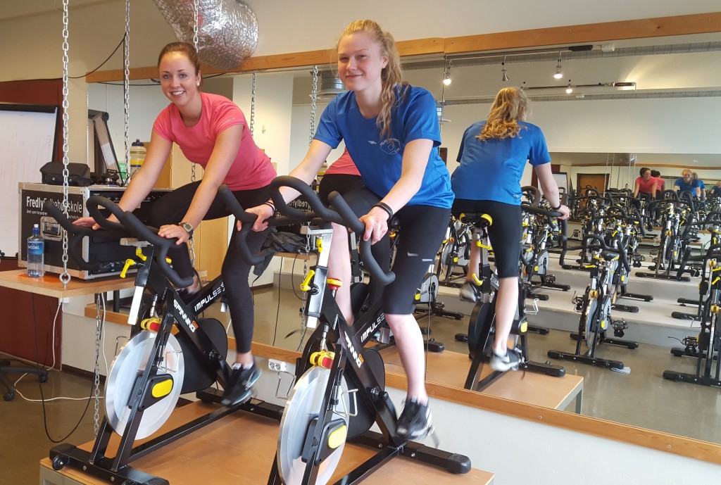 Både elever på folkehøgskolen og medlemmer fra lokalsamfunnet er ivrige deltagere på spinningtimene klassen setter opp.