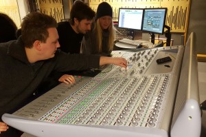 – Det fine med folkehøgskolen er at det er rom for alle der. Både for de som er helt sikre på at de vil jobbe med media, og for de som bare vil prøve for moroskyld. Man får teste ut mye, og det gjør at man raskt finner ut om dette er noe å satse på – eller om man heller vil studere noe helt annet, sier Ingar Jakob Feiring (t.v.). Lars Ankervold og Frida Marie Otterbeck er enige.