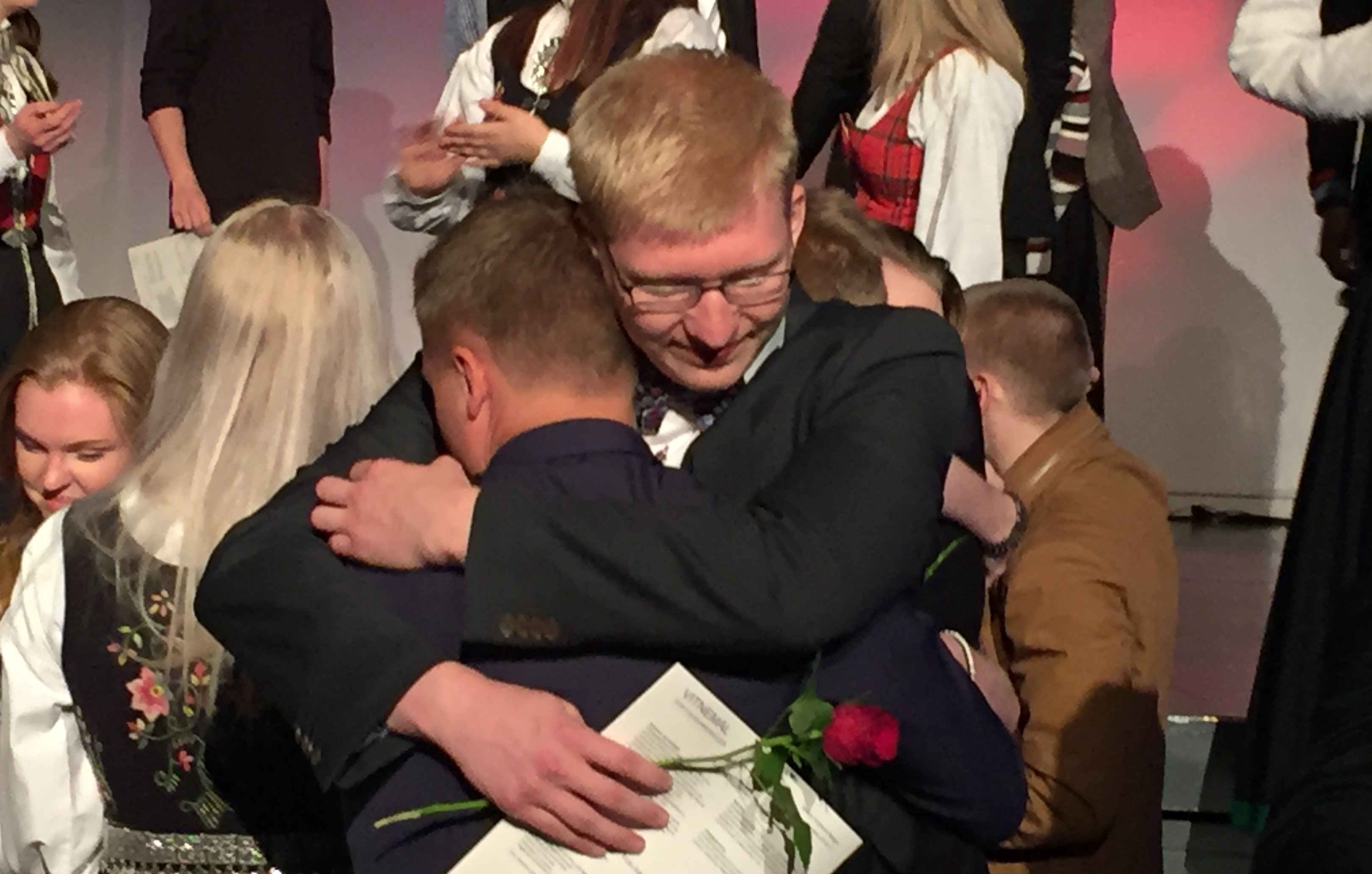 Alvoret trakk nærmere da rektor ba klasse for klasse om å reise seg og å komme opp på scenen. Der fikk hver enkelt elev sitt vitnemål og en god klem med på veien. Det var lærerne som delte ut vitnemålene. På folkehøgskolene har lærerne vært sammen med elevene sine mange timer hver uke i et år og de har hatt felles opplevelser på studieturer og fellesfag.