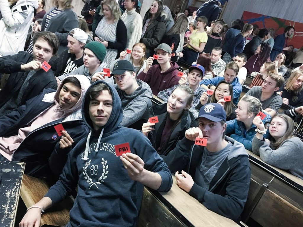 – Etter panisk streak-snapping, litt nervøs latter og mye summing ble telefonene registrert inn i bytte mot et rødt kort fra FBI. Dette kortet kunne elevene når som helst levere inn for å få igjen mobilen sin. Kassa med mobiler ble full, og ikke minst blytung. Det er ikke hver dag man løfter på 131 telefoner.