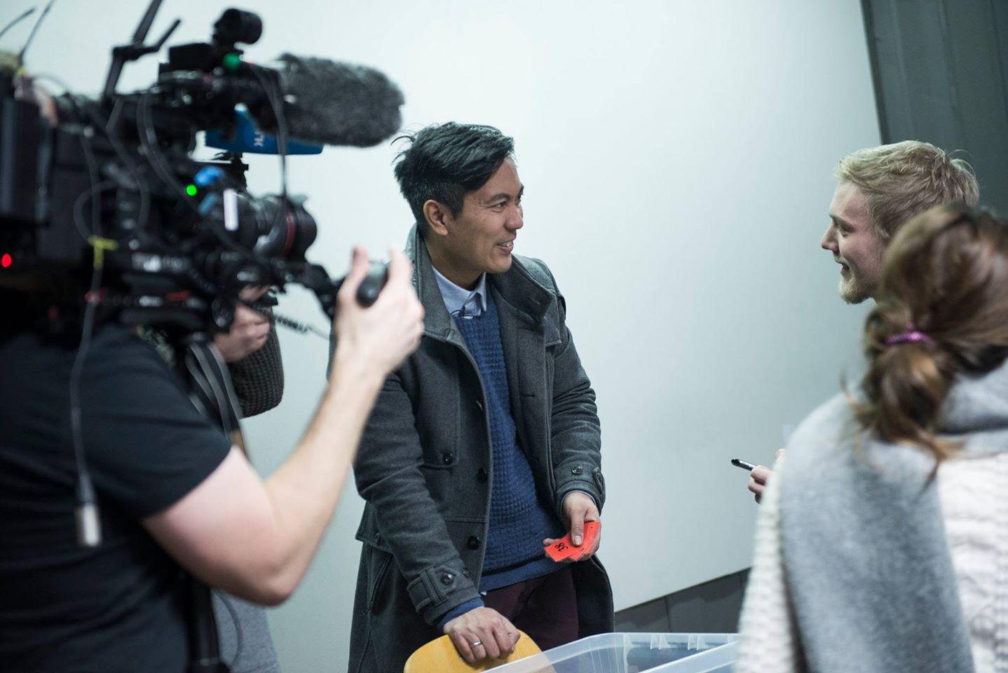 God stemning mellom programleder Christian Strand og elevene ved Elverum folkehøgskole. Foto: Elverum fhs