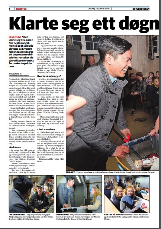 Mandag 22. januar kom NRK Forbrukerinspektørene med to fotografer, regissør og programleder Christian Strand til Elverum folkehøgskule. Etter ord for dagen, entret Strand rommet med en enkel beskjed: De neste 24 timene skal jeg ha alle – absolutt alle telefonene deres.