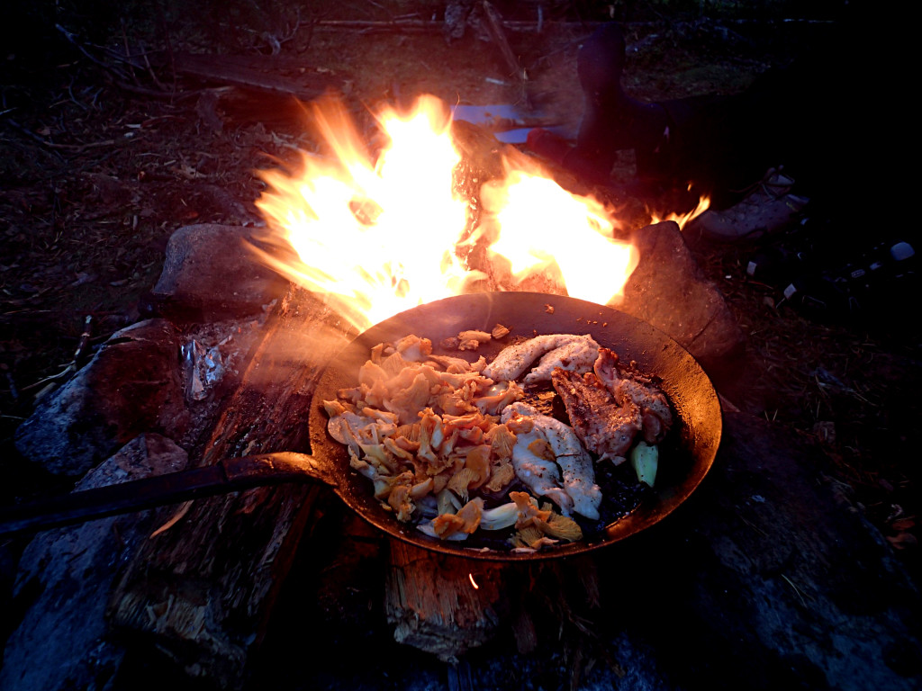 Arktisk kjøkken kan også være matlaging på bål. Her tilberedes selvplukket sopp og ørret. FOTO: Yngve Beddari