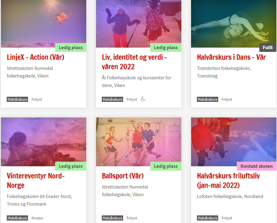 Det er fremdeles mulig å søke folkehøgskole for neste skoleår. Under finner du oversikten over ledige plasser, både på halvtårskurs og for vanlig skoleår.