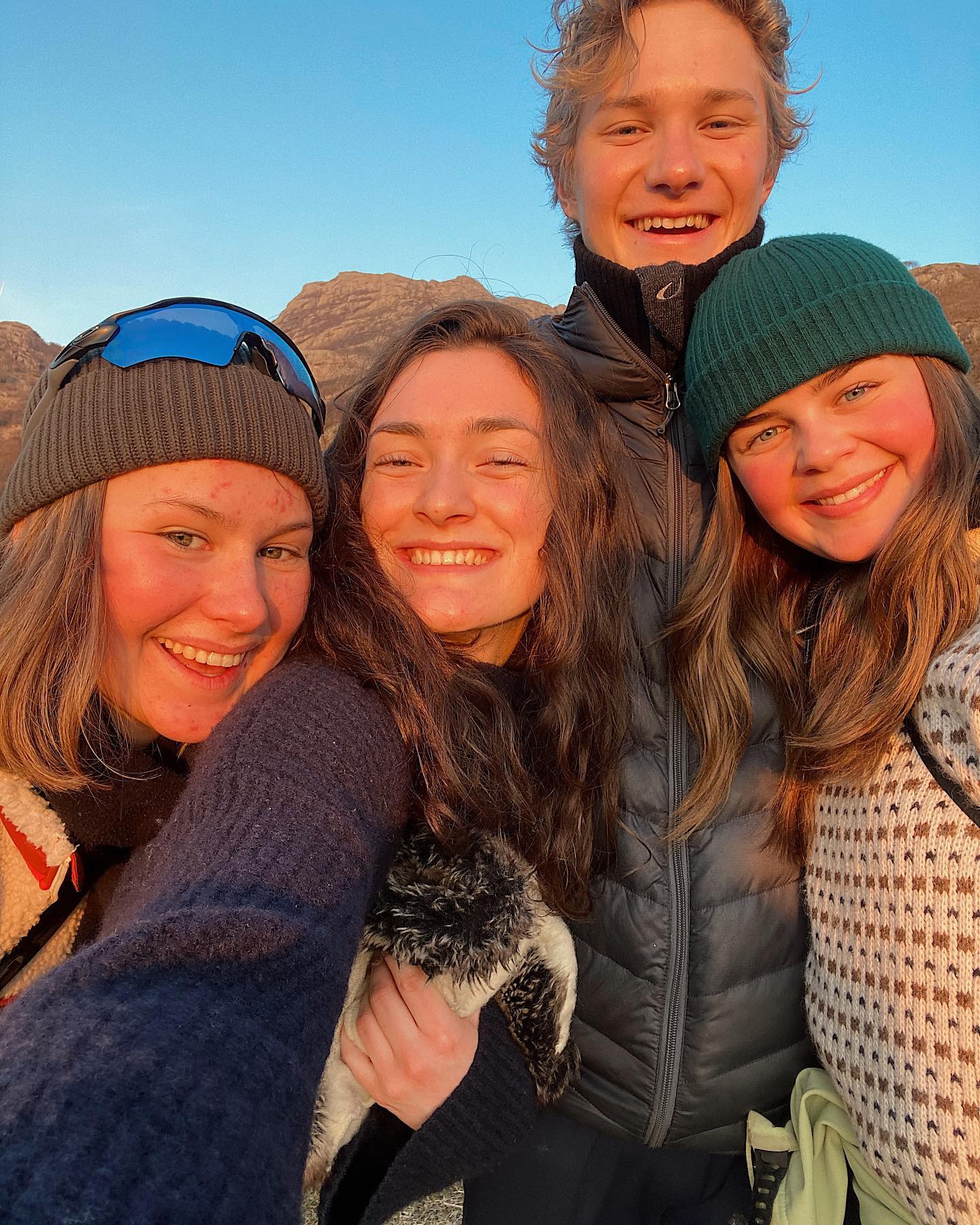 En gruppe med elever står i sola og smiler mot kamera.