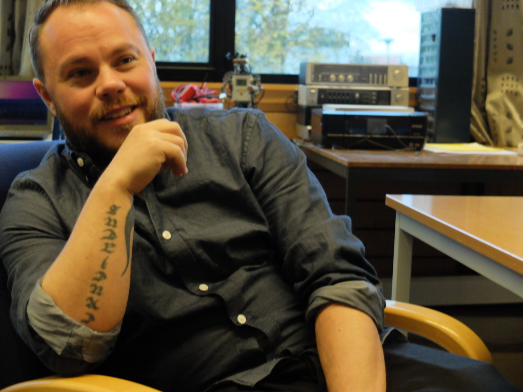 Han tar meg med inn i sitt klasserom – jeg ser meg raskt rundt, her er høytalere, diverse gamle radioer, cd-spillere, en Legorobot, 3-D printere, kabler, små databrikker, PCer og en masse duppedingser.
