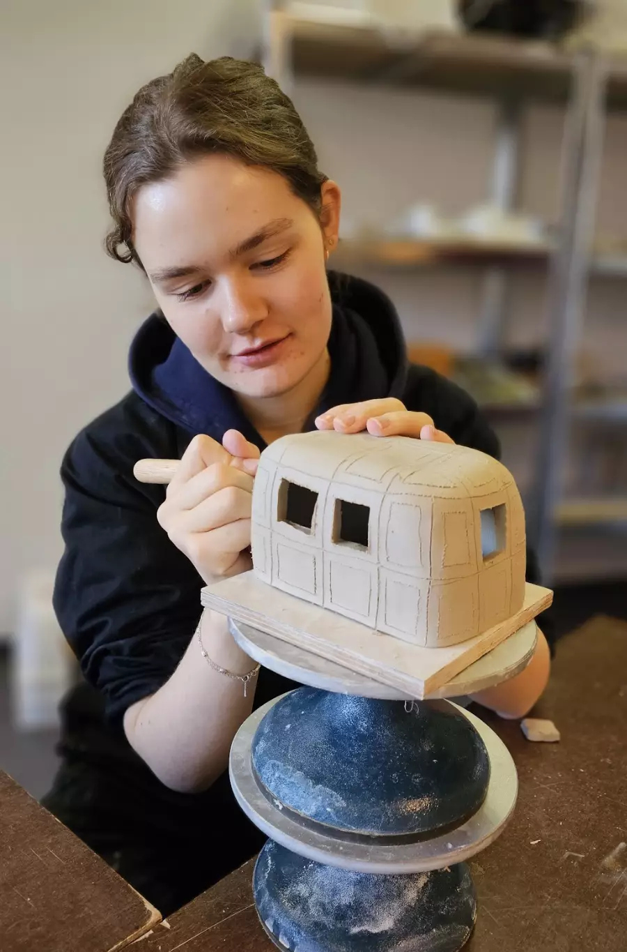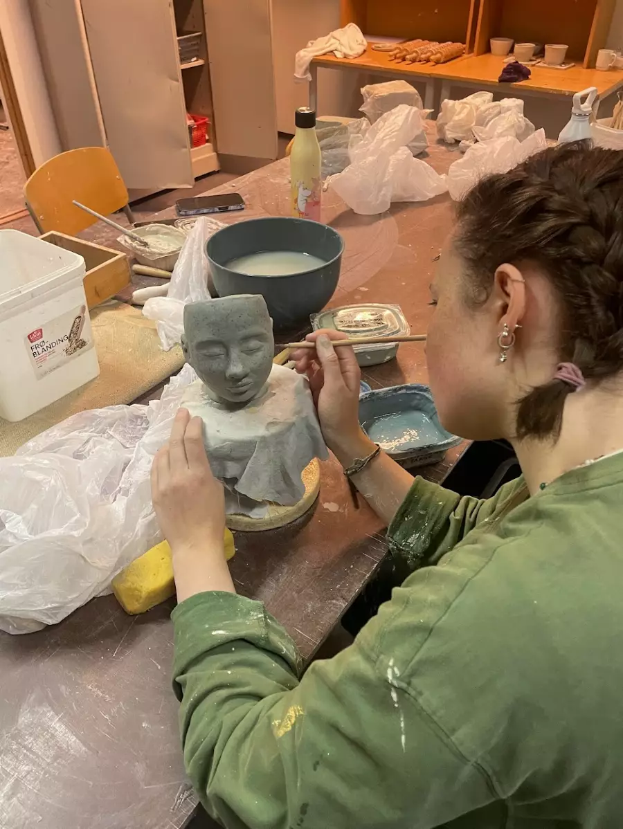 Mesteparten av året jobber du med keramikk. Du lærer å dreie, forme og bygge med leire. Vi brenner og glaserer i egne ovner. Du kan lage ting du kan bruke – kaffekopper, serveringsfat, skåler, lysestaker – eller jobbe mer fritt og lage figurer og former med uttrykk.