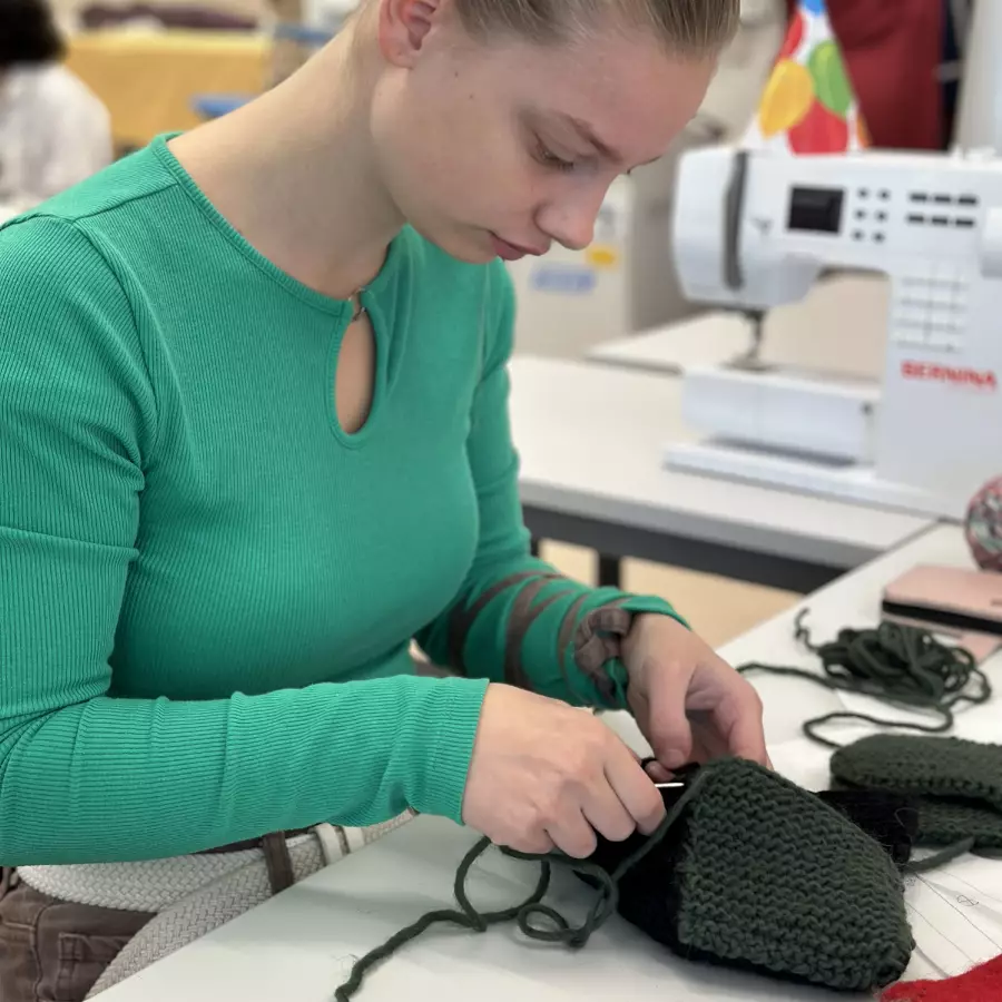 Her lærer du alt om mulighetene med strikking og hekling. Det kan lages alt fra enkle ting til å designe og strikke/hekle egne plagg. Du kan også lære trådteknikker som hakking, gimping, pjoning o.l.
