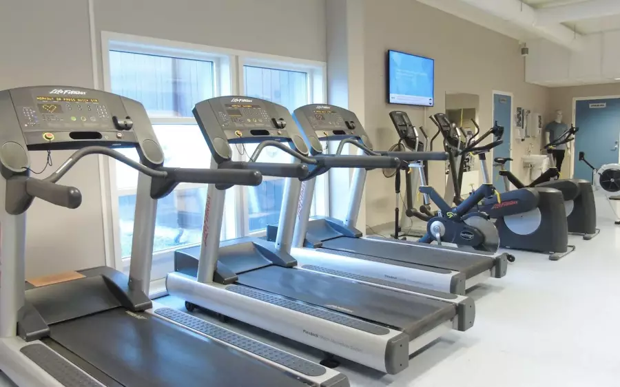 Treningen foregår til musikk under ledelse av en instruktør på treningssenteret "Sterke Nils" i Seljord.