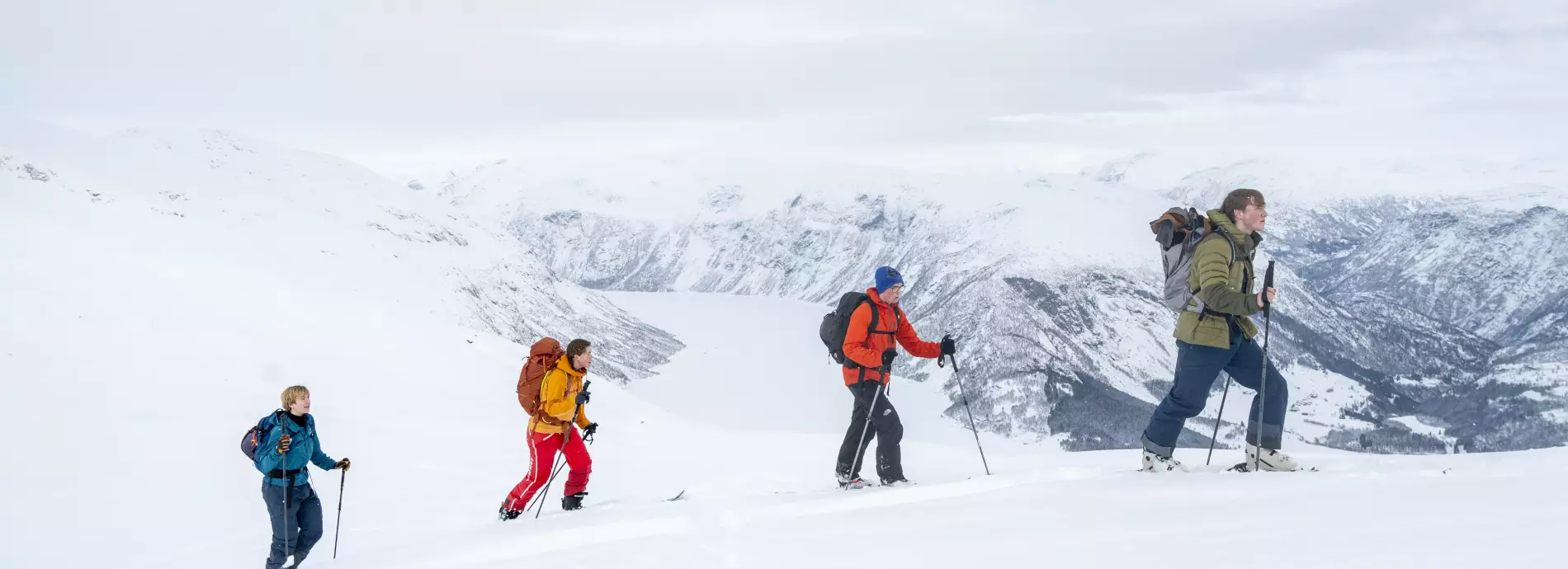 Her får du en vinter full av opplevelser, der målet er å gjøre deg trygg i fjellet og i stand til å planlegge egne turer. Vi starter med det viktigste: finne den beste snøen og ferdes trygt på toppturer.