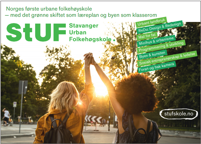 Velkommen til Stavanger Urban Folkehøyskole - the StUF that dreams are made of. Stavanger tilbyr et urbant miljø, med kunst, musikk, innovasjon og en herlig atmosfære. Skolen har gode bånd til byens rike kulturliv og vi er et pulserende sted for kreativitet, vekst og fellesskap. Her er det gåavstand til alt, fra innholdsrike bruktbutikker, spennende scener og til din kommende favoritcafé. Med folkehøyskole i byen kan vi tilby våre studenter et stort faglig nettverk av dyktige og inspirerende samarbeidspartnere. Her får du både fordype og fornye deg i temaer som inspirerer deg. Vi har egen karriereveileder som gir deg tryghet og profesjonell hjelp til veien videre.
