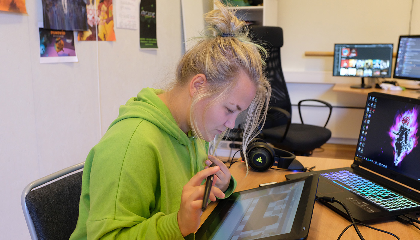 Elsker du spill og ønsker å ta tegningene dine inn i den digitale verdenen? Her lærer du å utvikle pixel art, animasjoner, concept art og game art! Vi lager også spill i lag med Game Design-linja.